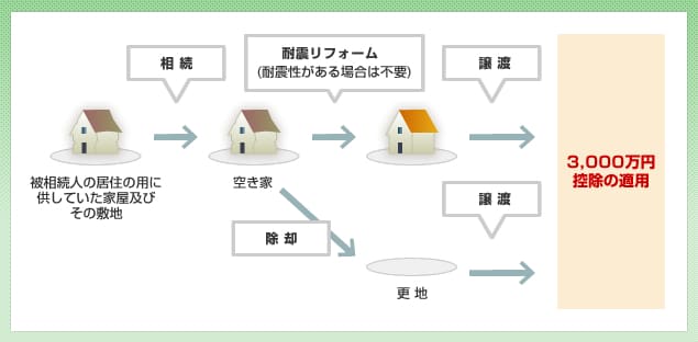 被相続人居住用家屋及びその敷地の用に供されていた土地等を相続により取得した方が平成28年4月1日から平成31年12月31日までの間に下記の要件を充たす譲渡をした場合にはその譲渡に係る譲渡所得の金額について居住用不動産の譲渡所得の3,000万円控除の適用を受けることができます。