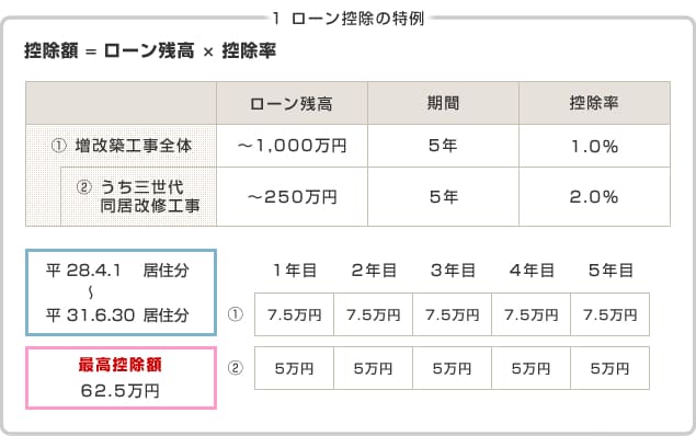 三世代同居改修工事の「住宅借入金等」の年末残高1,000万円以下の部分について、一定割合(250万円限度で2.0%)を乗じた金額を5年間の各年において所得税額から控除。