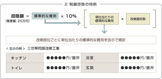 三世代同居改修工事の標準的な費用の額の10%相当額をその年分の所得税額から控除。 ※その年分の合計所得金額が3,000万円を超える場合には適用しない。